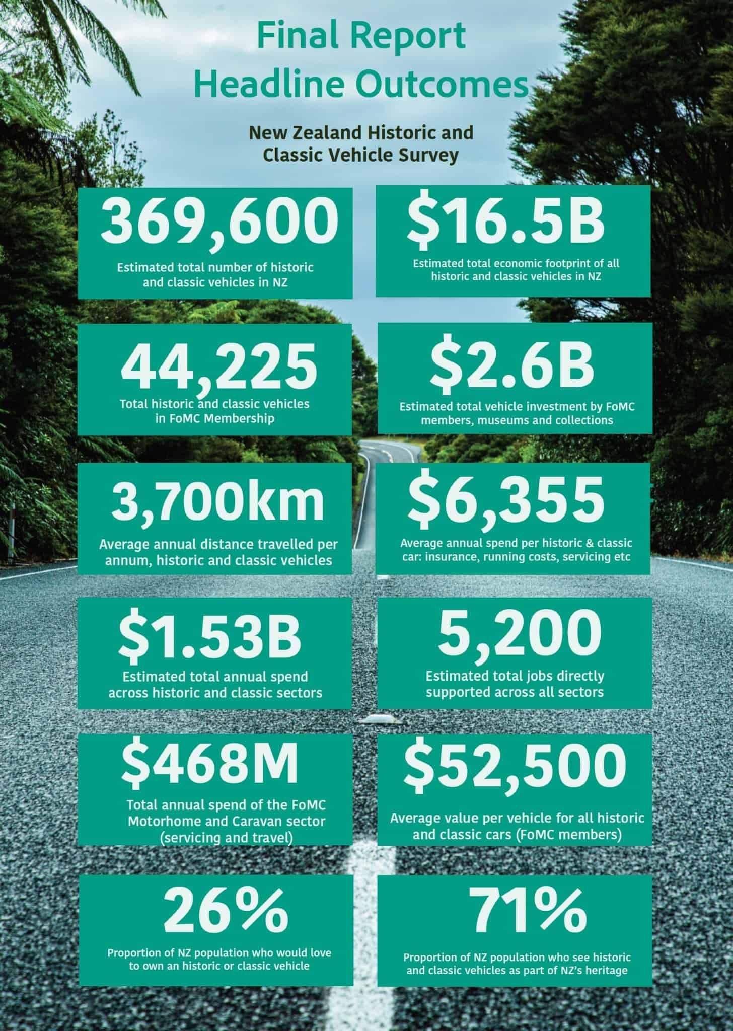 The FINAL results of the NZ Historic and Classic Vehicle Survey are now available (25 February 2024). "The Survey has estimated the total historic and classic sector to be approximately 370,000 vehicles...", “With “…a total annual spend exceeding $1.5 billion…”, "...an annual spend of $6,355 per annum per vehicle...".