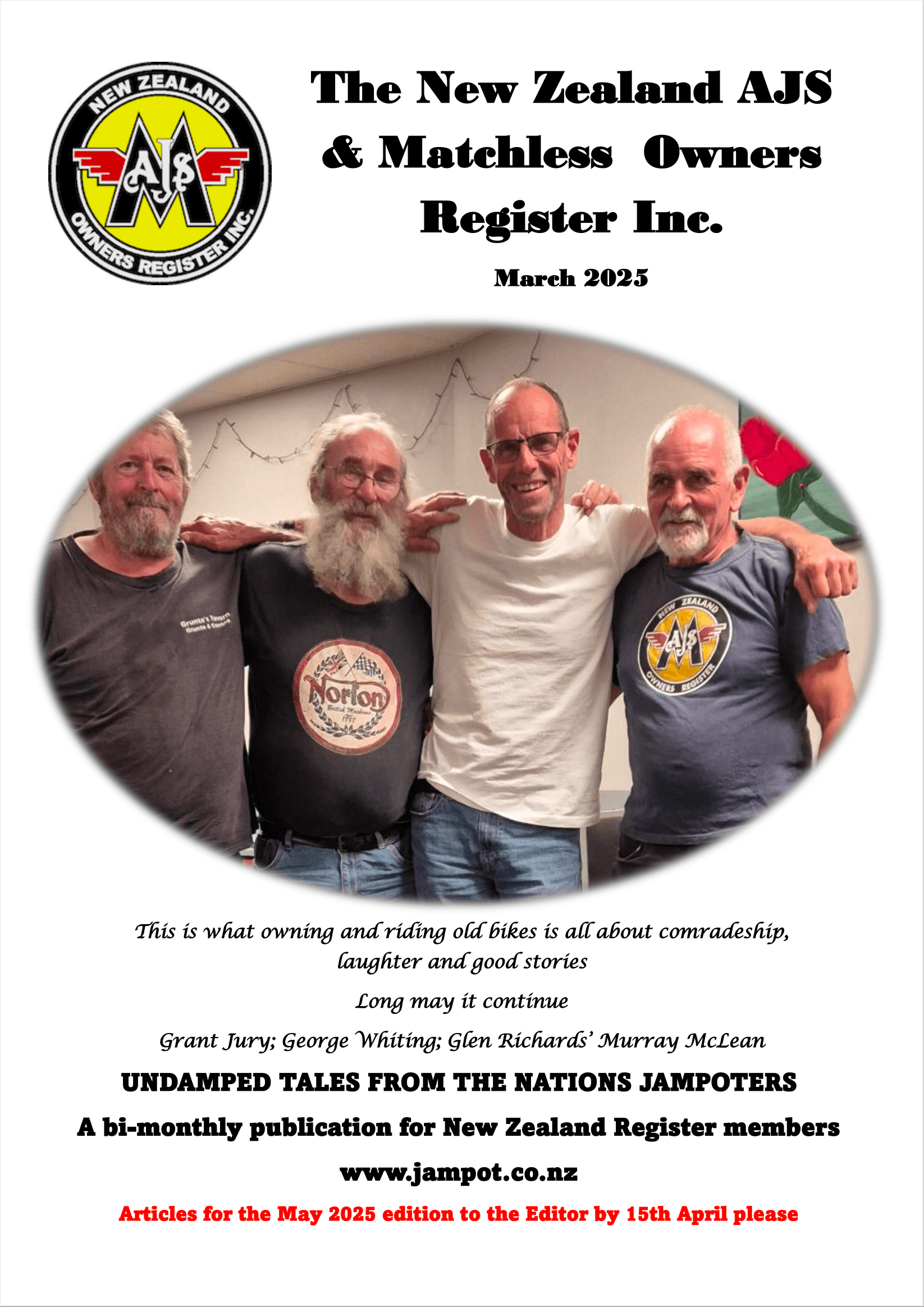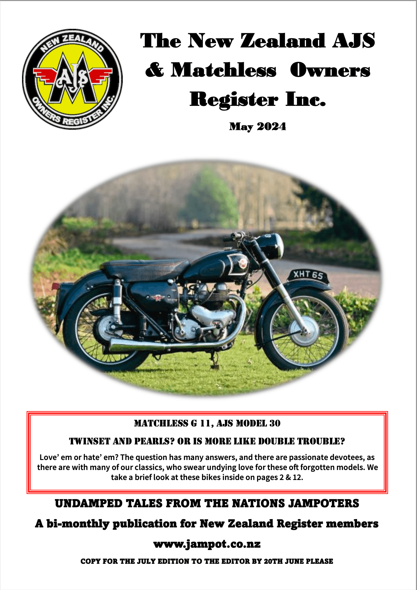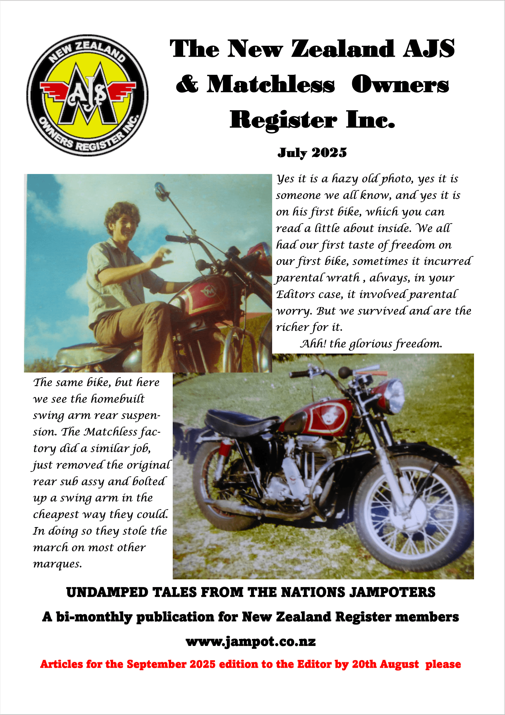 The NZ AJS & Matchless Owners Register Inc. publishes its motorcycle newsletter bi-monthly with a circulation both in NZ and overseas. The motorcycle newsletter is free to members and is available with a dash of colour (but, sometimes in black and white) via post or in full colour via PDF format via email. The issue is posted to be in letterboxes (in NZ) or email boxes by the 15th of every even numbered month viz Feb, April, June, August, October and December. A total of six issues per year.
